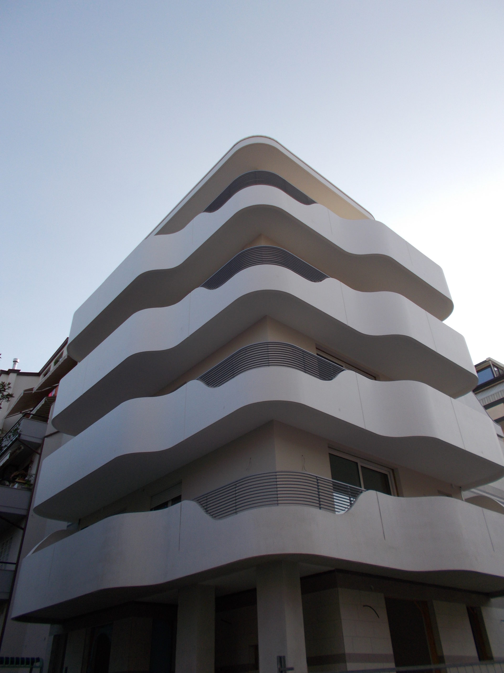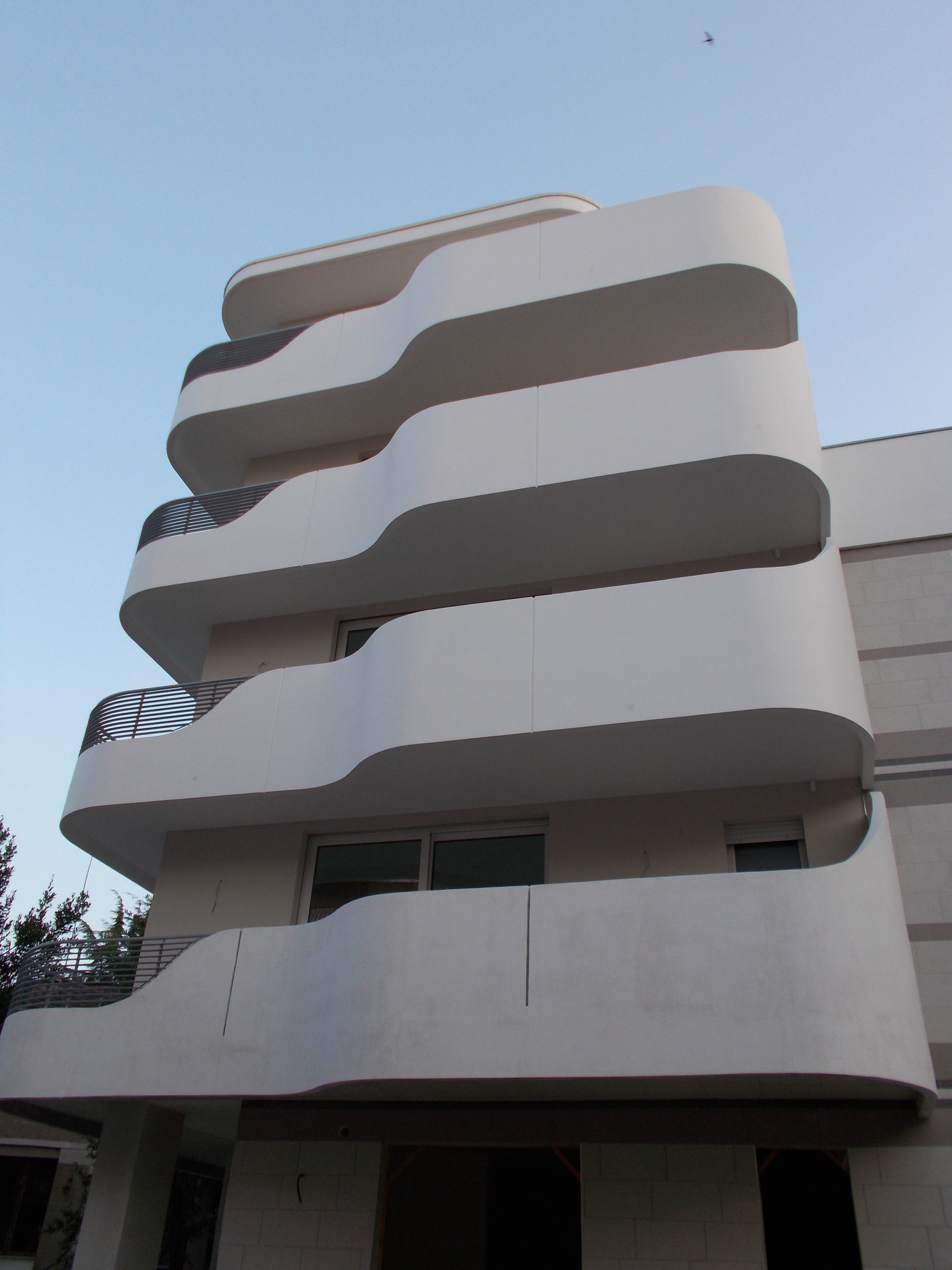 Gli aggetti (balconi) sono avvolti da velette in cemento armato flesse come fogli di carta conferendo motivo dominante al prospetto del fabbricato proiettato verso il mare. Un’insieme di “vele” che spingono Andromeda verso l’azzurro del Mare Adriatico, con un effetto ottico davvero sorprendente.